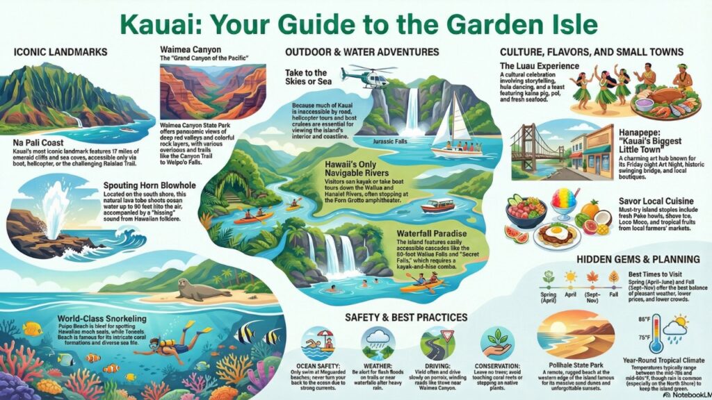Kauai Hawaii is often called the “Garden Isle,” and it lives up to its name with lush rainforests, dramatic coastlines, and an atmosphere that feels both adventurous and laid-back. Whether you’re hiking along the cliffs of the Na Pali Coast, watching the sunset at a hidden beach, or experiencing Hawaiian culture at a traditional luau, the island offers something unforgettable for every traveler.