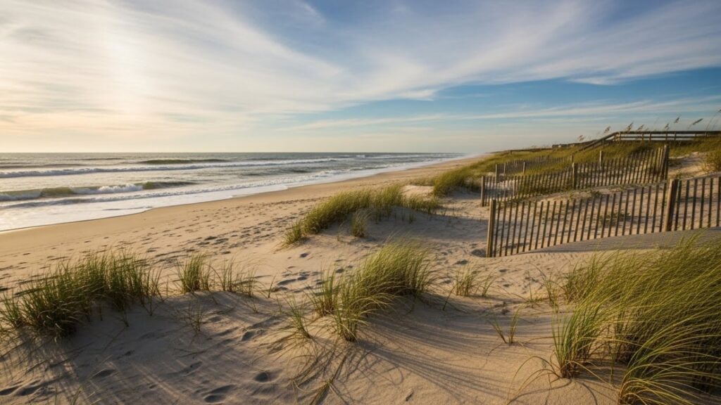 The Outer Banks offer a raw, windswept beach experience shaped by barrier islands, shifting dunes, and wide stretches of undeveloped coastline. The landscape feels untamed and historic, with nature clearly in control.