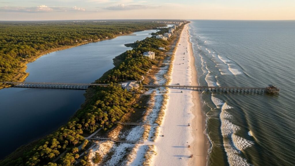 Offering a peaceful alternative to the busy beaches, Waterfront Park sits along Wolf Bay with shaded picnic areas, a long fishing pier, playgrounds, and walking paths. Families love its gentle water access and quiet vibe, making it a great break from the heat and crowds.